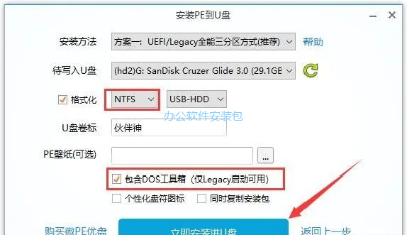 4.选择将U盘格式化为NTFS,勾选包含DOS工具箱,点击立即装进U盘。